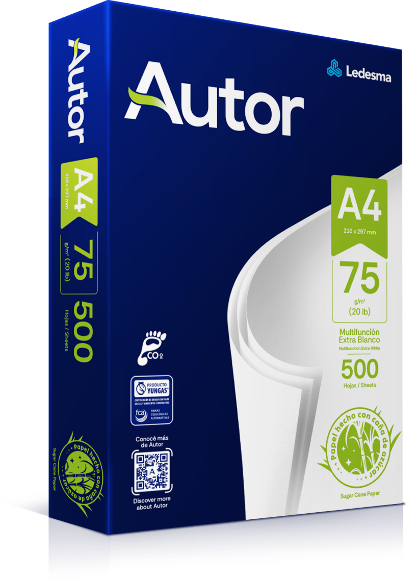 Autor es un papel hecho con caña de azúcar, reciclable y biodegradable, inspirado en la innovación y el cuidado de la naturaleza.